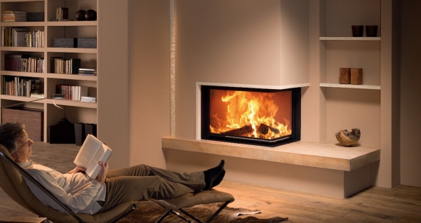 Wkład kominkowy z narożna szybą. Boczne skrzydło stałe otwierane drzwiczki frontowe.